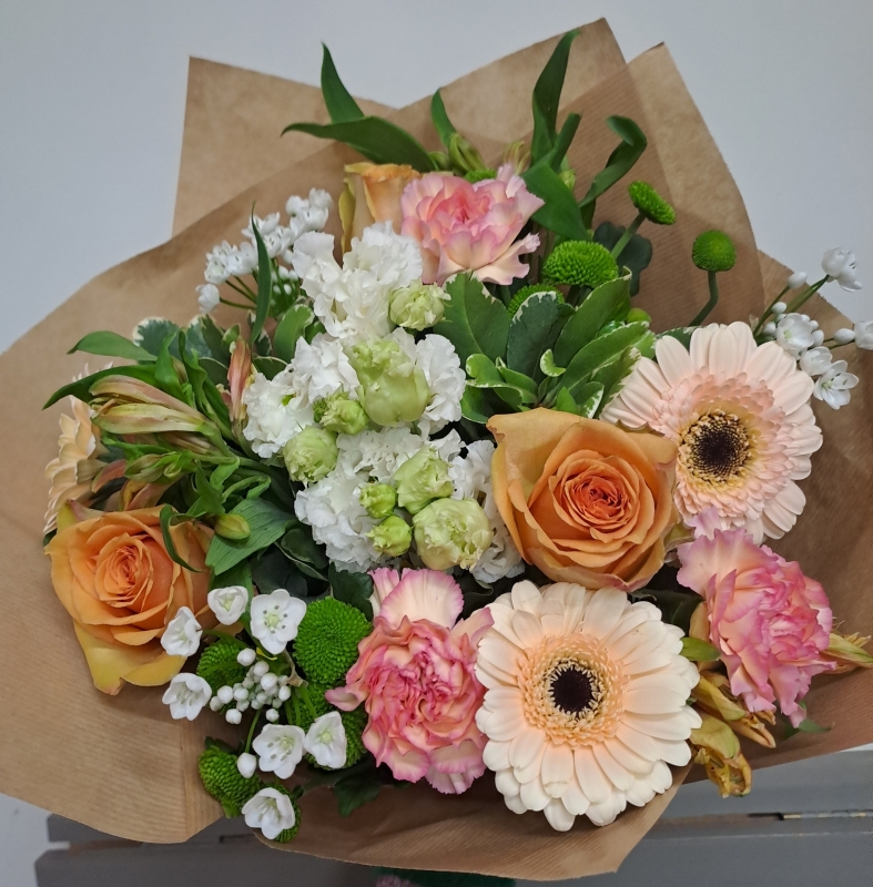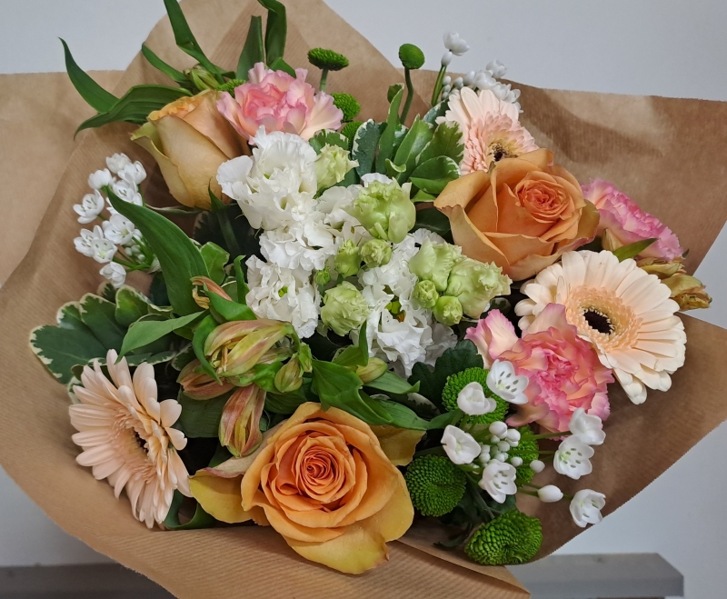 Lovely handtied bouquet of peach and gold shades