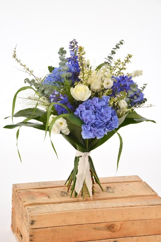 Reflecting the blues and whites of the summer sky, Beach is an elegant handtied with Blue Hydraenga, Delphinium and White Roses.